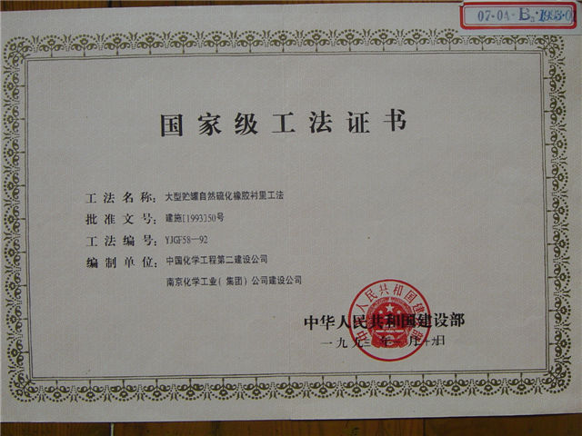 12 | 大型贮罐自然硫化橡胶衬里工法 | 1991年度化工部级工法 、 1993年度国家级工法 | 翁兆春 | 1991.08 |