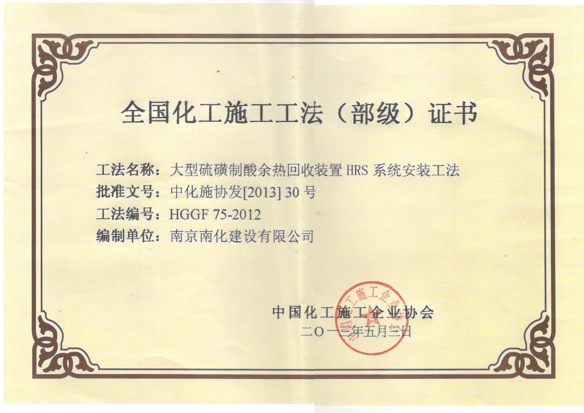 62 | 大型硫磺制酸余热回收装置HRS系统安装工法 | 全国化工施工工法(部级) | 何洋、赵杰 | 2013、7 | 工法编号:HGGF75-2012 批准文号:中化施协发[2013]30号 | |