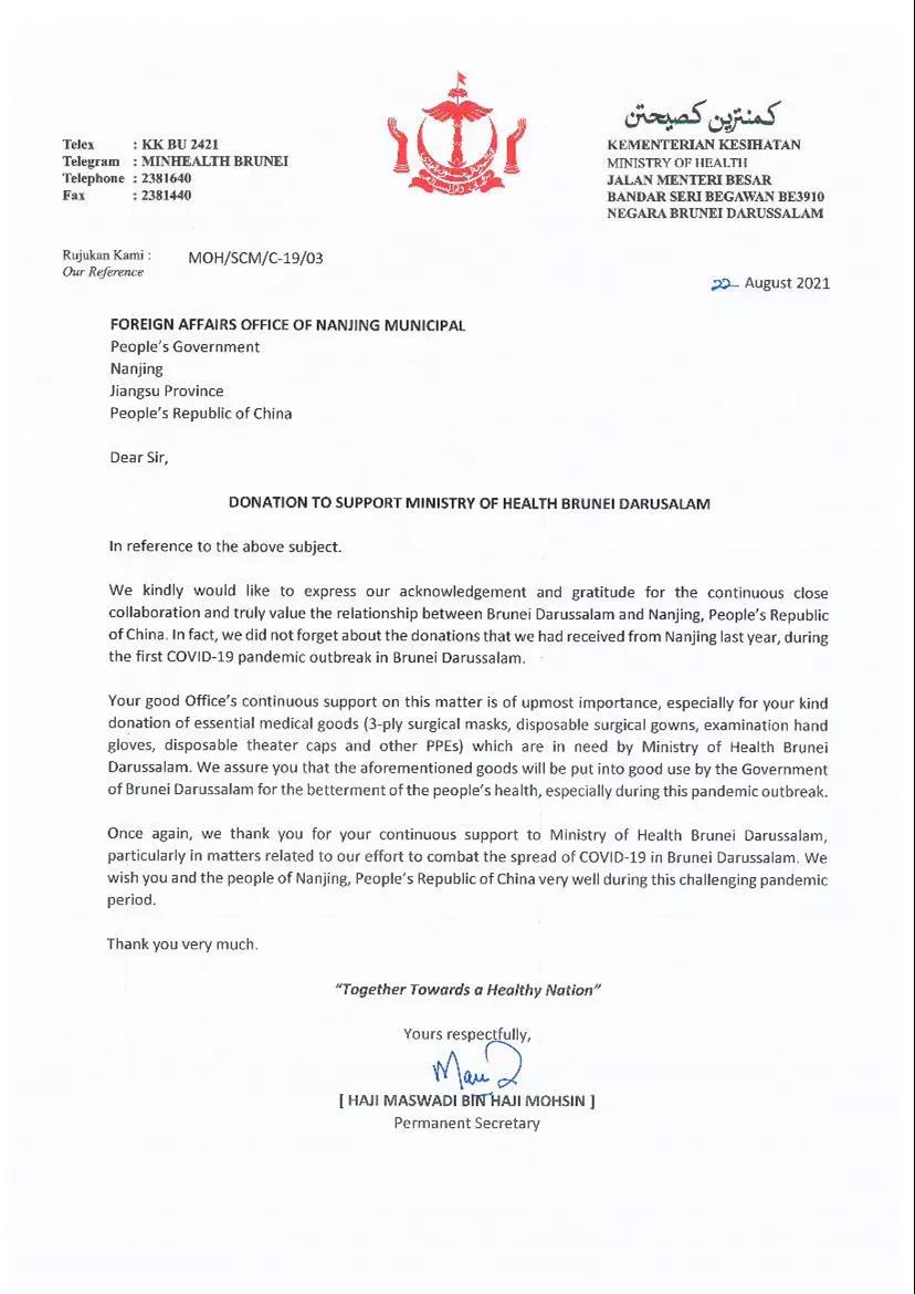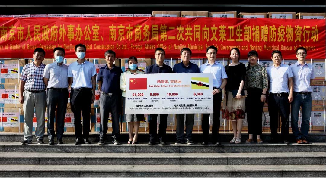 此次捐赠是继去年3月之后,公司第二次携手南京市外事办公室对文莱卫生部进行的一次捐赠。在市政府的关心支持下,公司第一时间进行有序采购,并调用自备库存,制定出详细的物资援助计划,紧急筹措一大批防疫物资,共同筹备了口罩91000只、医用防护服6000套、防护面罩5000个、检查手套10000副。该批物品运到文莱后,中国驻文大使代表捐赠方,文莱外交、内政、卫生三位部长代表接收方参加捐赠接收仪式。