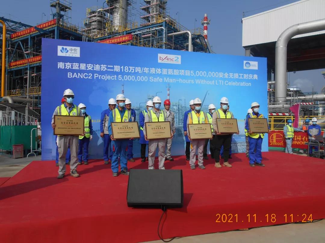 2021年11月18日,由公司承建的蓝星安迪苏(南京)有限公司二期18万吨/年液体蛋氨酸项目成功实现500万安全无损工时,项目现场举办了热烈的庆典活动。