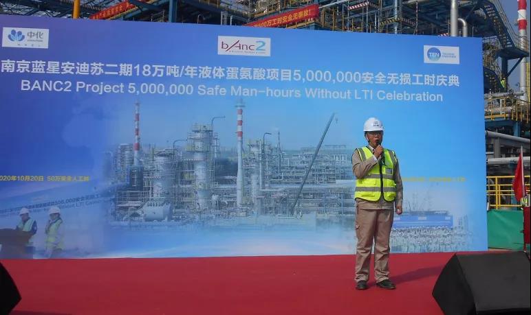 参加庆典的有业主蓝星安迪苏(南京)有限公司,德希尼布管理公司,监理单位及各参建单位的领导及相关人员。业主代表庄重而骄傲的宣布:蓝星安迪苏(南京)有限公司二期18万吨/年液体蛋氨酸项目成功实现了500万安全无损工时,在此期间,项目上没有发生损失工时事故,这是项目现场所有参建人员的共同努力、悉心管理获得的结果。“行百里者半九十”,希望南化建在后续的建设中能够对安全工作常抓不懈、再创辉煌。