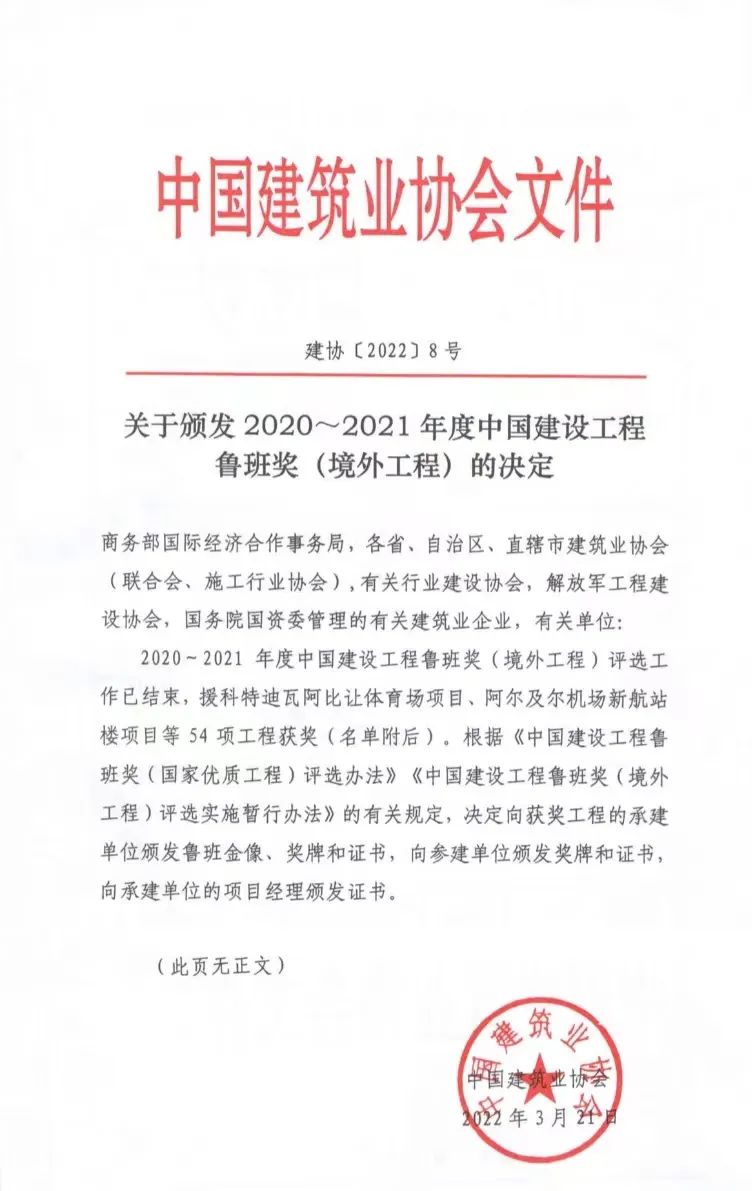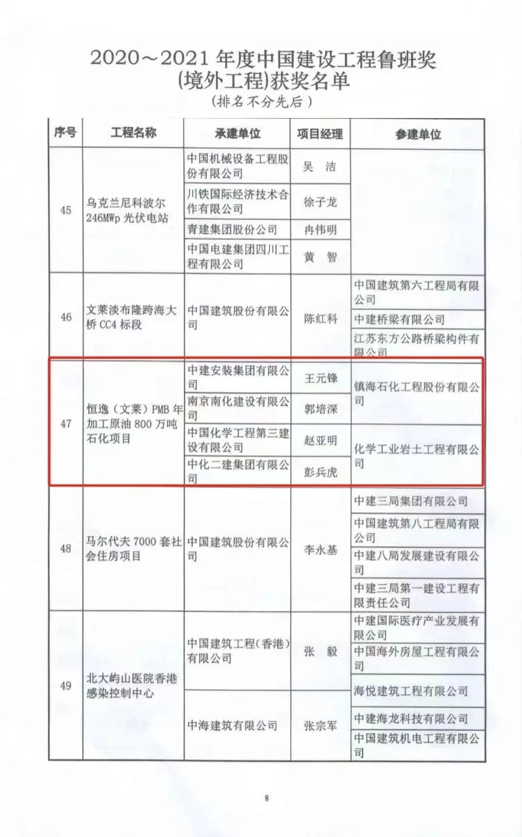 近日,中国建筑业协会公布了2020~2021年度中国建设工程鲁班奖(境外工程)获奖名单,共54项境外工程获奖。由公司承建的“恒逸(文莱)PMB年加工原油800万吨石化项目”榜上有名。这是继2019年12月荣获中国建设工程鲁班奖和2021年12月份荣获国家优质工程金奖之后,近三年来公司荣获的第三项国家级工程质量奖。