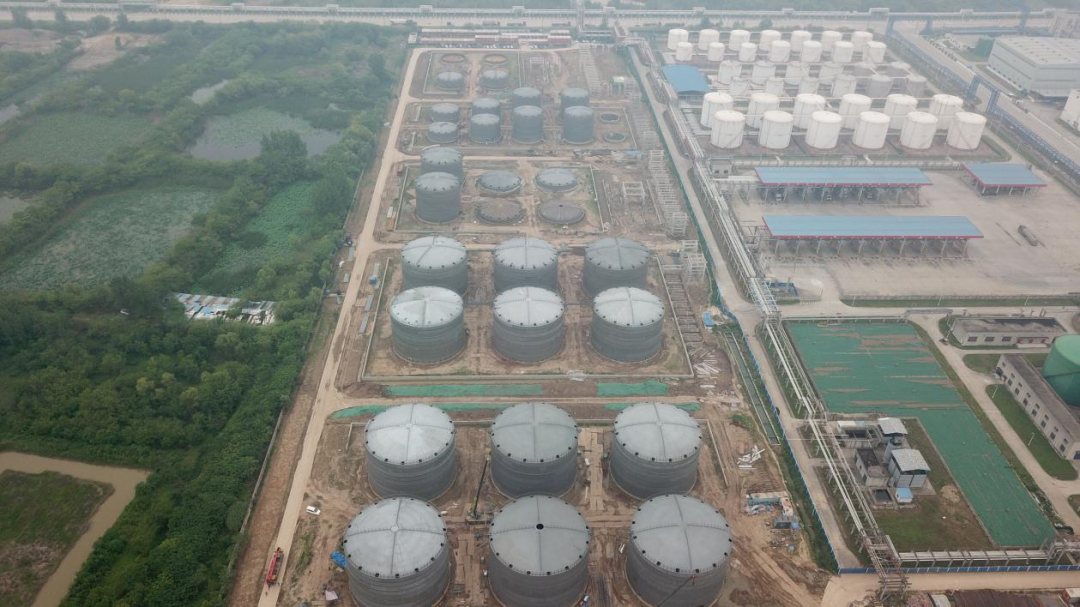 武汉新港化工新城石化码头及液体罐区续建工程项目位于武汉市青山区化工五路二号,项目包括新建储罐34座,总罐容为20.7×m3及配套的交换站、装卸设施等。其中化工品及油品为34座内浮顶储罐,续建工程分为5个罐组:T4罐组包括6座3500m3,T5罐组包括8座3500m3和2座1000m3储罐,T6罐组包括6座6000m3储罐,T7罐组包括6座10000m3储罐,T8罐组包括6座10000m3储罐。以及相应的交换站、系统管廊、汽车装卸站、氮气站、给排水、消防、电气、自控、总图、结构等配套内容。