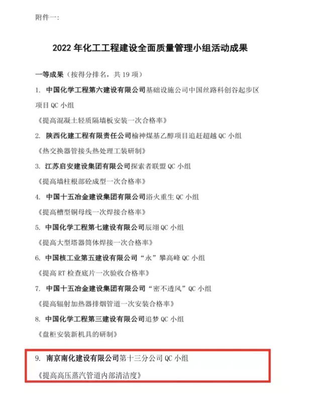 近日,中国化工施工企业协会公布了“2022年全面质量管理小组活动成果交流评审结果”。22家单位共申报92项成果,经过初审、发布交流、专家评议、评审委员会最终审定,公司三项成果均获得较好的成绩。