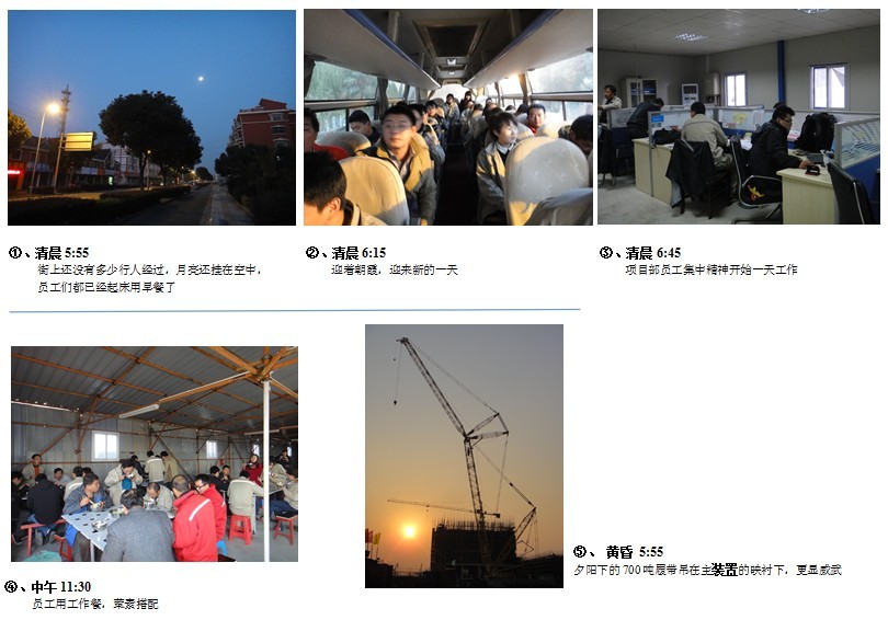 早饭后,六点一刻,天色还有些灰暗,大伙乘上大巴车,来到了现场,新的一天开始了。每个人走上了各自的工作岗位,制模的、打水泥的、焊接的、吊设备的等等。莫大的现场顷刻之间机器轰鸣、车水马龙、人来人往、川流不息,呈现出一片繁忙景象,划破了带有凉意的清晨寂静,唤醒了巴斯夫玉树项目的沉睡,似乎有些与外界的天空格格不入。但他同时又映衬着第十五项目部在玉树项目上工作精神和吃苦耐劳;抒发着企业的生机与活力;凸显着公司各项管理制度的严格、科学和完善,又使更多的局外之人敬佩不已,彰显着企业特色。一眼望去,物料摆放整齐,道路畅通,标识指示明显,怎么看怎么象一幅赋予生命力的美好画卷。